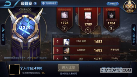 进入首页以后,左边有一个排行榜,看到的是好友榜,点击箭头会跳出“全区天梯排行”,点击切换榜单然后选择巅峰榜,就可以看到巅峰积分排行了。