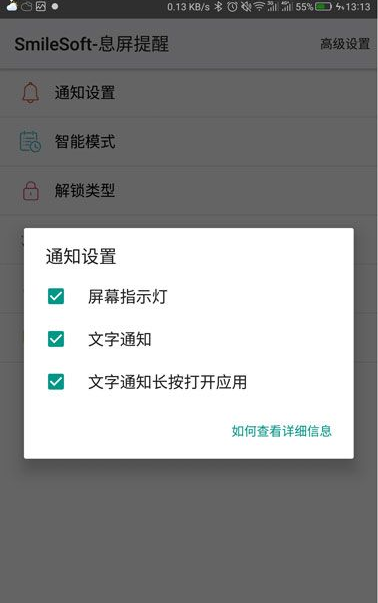 由于采用锁屏方式实现都息屏提醒,在解锁类型处选择指纹解锁会有最好的体验,这样不需要你进行二次解锁。提供了多种息屏提示功能的激活方式,三星手机提供的短信/电话等信息显示的功能,SmileSoft 熄屏提示也很好的复制了。
